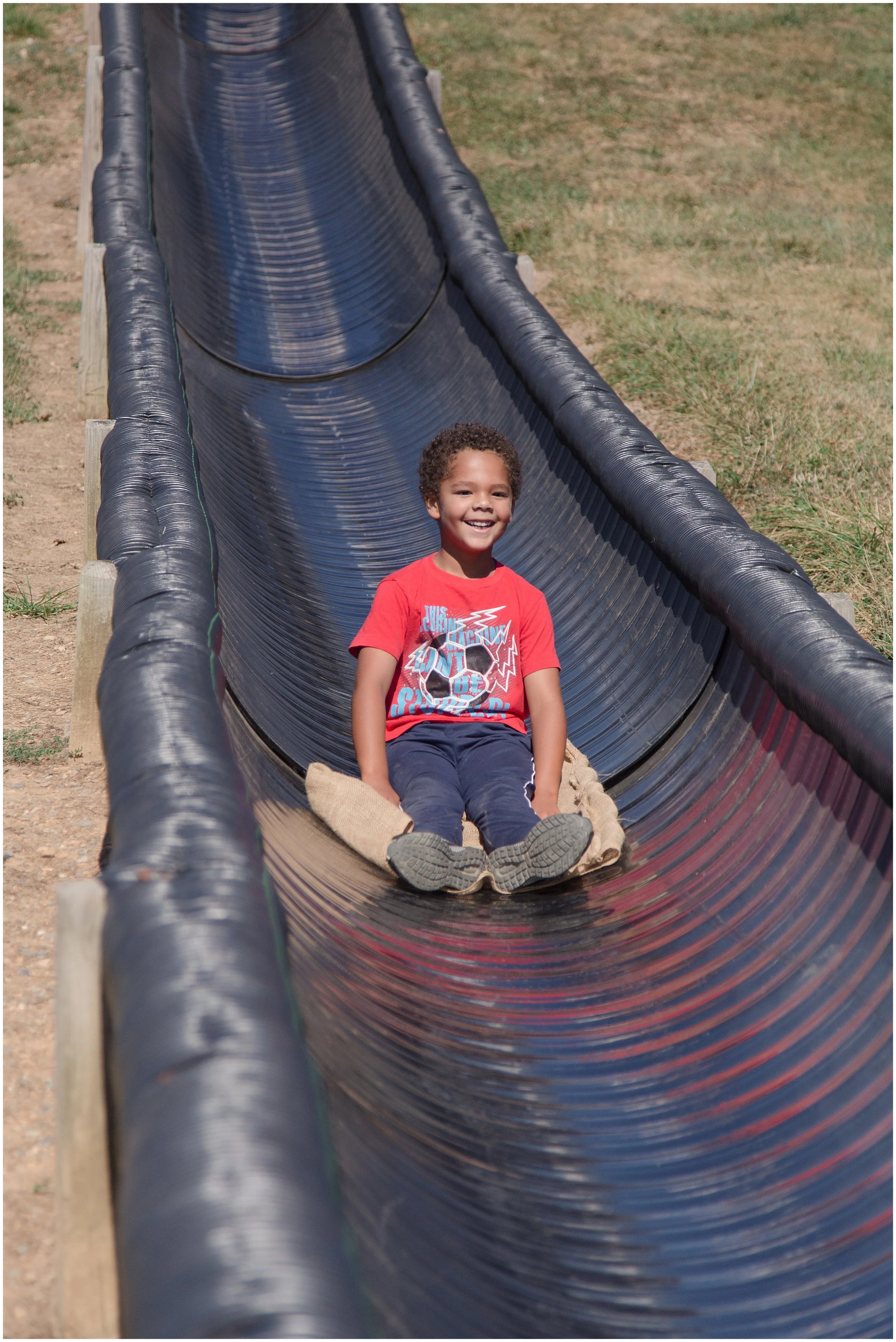 It was one of those fast “potato sack” slides. At first, he was terrified and would only go down with me. the “I don’t want to do this” is pretty clear!