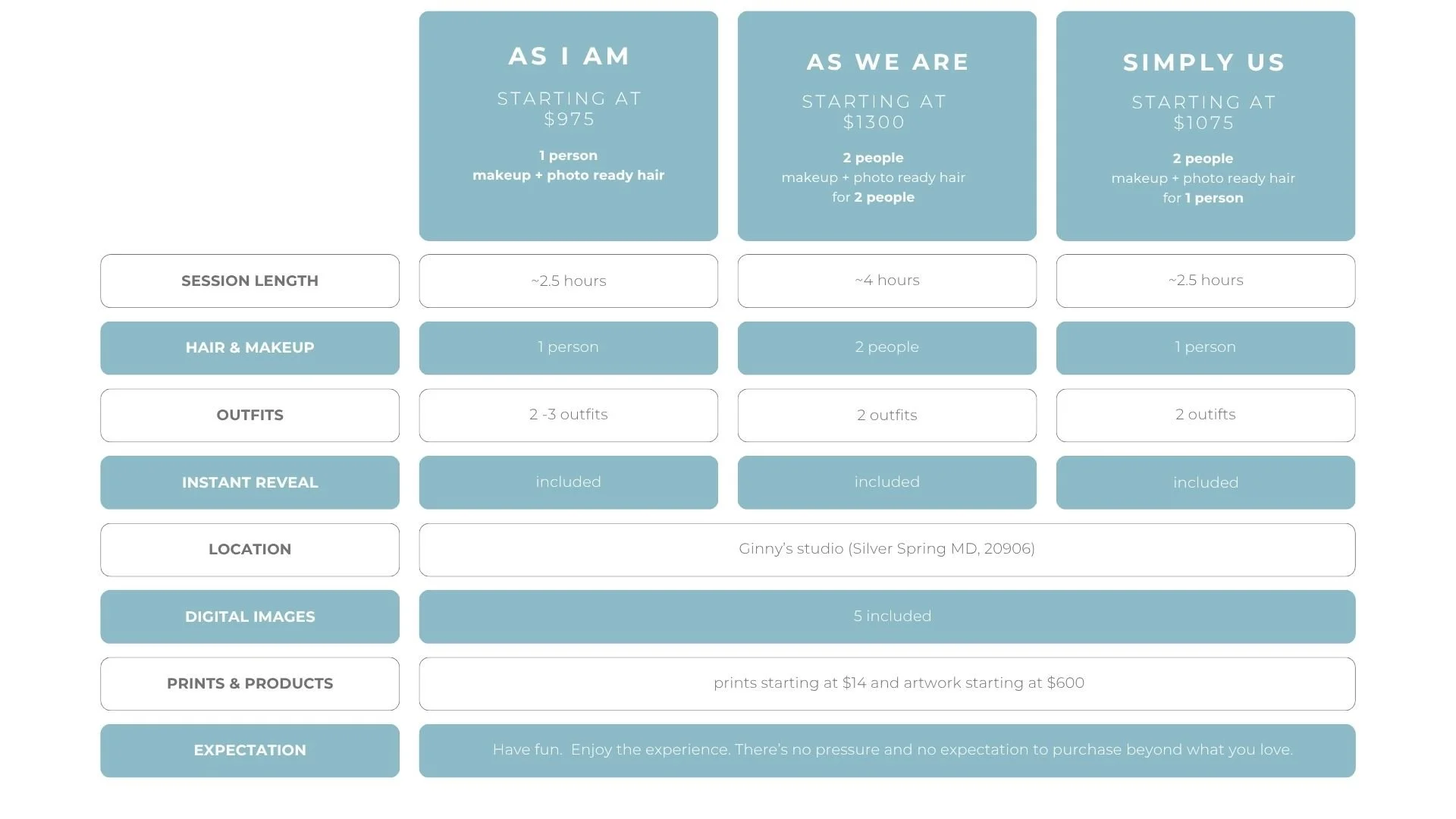 That includes time for hair and makeup, the session itself, and your image reveal afterward.